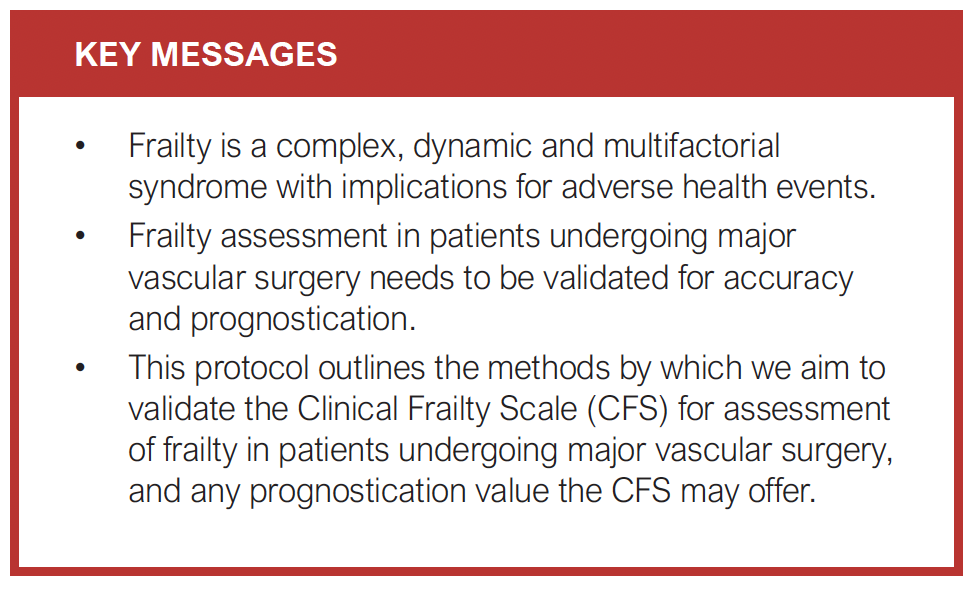 Although there have been many studies of frailty in patients undergoing major vascular surgery,11 there is no standardised approach to frailty assessment in these patients. The CFS is a rapid method of frailty screening which may have prognostication value but is yet to be convincingly validated in the population of vascular patients. This study will contribute to the growing field of frailty literature by validating the CFS and NVR four levels of frailty in vascular patients. It will also improve on existing data by validating these methods of frailty assessment in each subpopulation of the vascular cohort: patients undergoing MLLA, AAA repair, lower limb revascularisation and CEA. If the CFS is valid, this study may also offer insights into the prognostic value of frailty assessment, identifying whether baseline preoperative frailty is an independent risk factor for adverse outcomes in patients undergoing major vascular surgery.