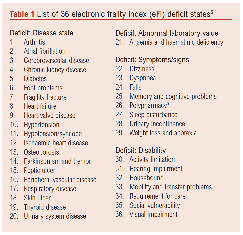 The eFI score will be collected for all consecutive patients admitted under the vascular services and will be extracted from GP records or calculated using the eFI guidance note (Table 1) when the GP score is not available. This is calculated as follows: eFI = number of deficits/36 (total number of deficits).