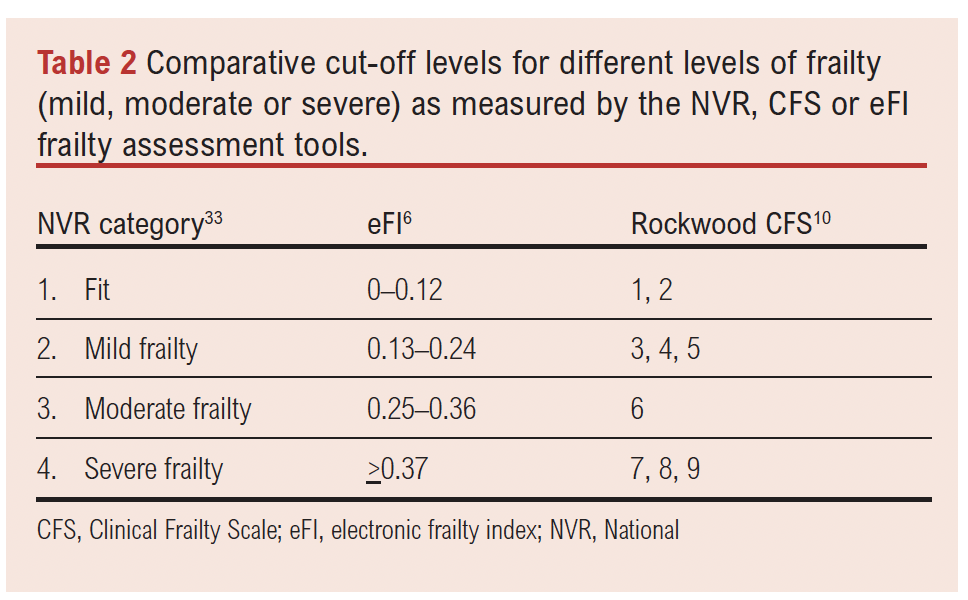 Since 2019 the NVR has recommended that commonly used formal frailty assessments, including the CFS, may allow patients to be categorised as: