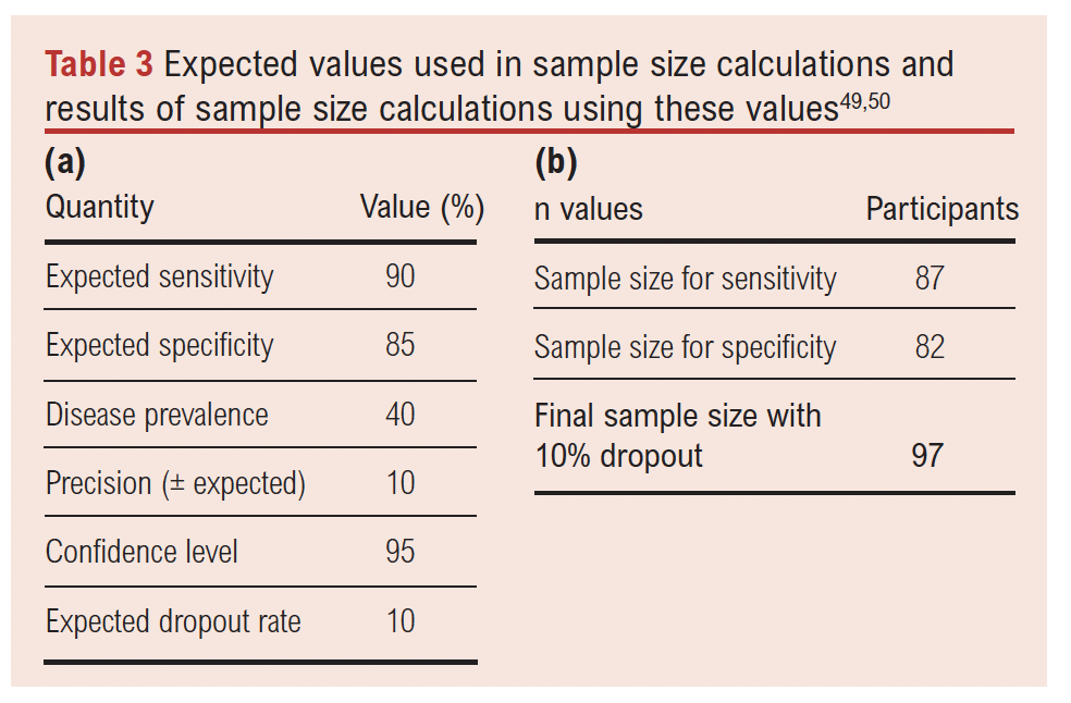 The local prevalence of frailty is taken to be 43%, based on a recent trust frailty audit.49 An expected sensitivity of 90% and specificity of 85% have been estimated from other patient groups in the literature,50,51 since no studies have clearly established the sensitivity and specificity of CFS for identifying frailty in vascular patients. A 10% dropout rate (missing data) has been included in the sample size calculations as it is possible that not all patients will be assessed for frailty preoperatively. From the values shown in Table 3a,52,53 97 patients will be required (Table 3b). For subgroup validity, this means 97 patients will be required per type of procedure (MLLA, AAA repair, lower limb revascularisation and CEA), giving a total sample size of 388 to determine the diagnostic validity of CFS compared with eFI across each vascular patient subgroup.