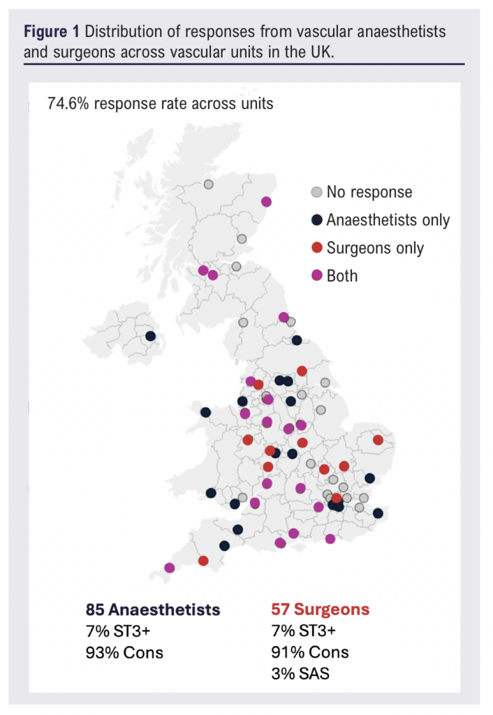A national cross-sectional survey was conducted between December 2024 and June 2025. A questionnaire was piloted internally and the survey wording was shared with and approved by the research committees of the Vascular Anaesthesia Society of Great Britain and Ireland (VASGBI) and Vascular Societies of Great Britain and Ireland (VSGBI) prior to circulation. The survey was hosted on the VASGBI online survey platform. Members of VSGBI and VASGBI were invited to participate through direct email communication and professional mailing lists; no financial incentives were provided. Several answers per unit were allowed. An example template of the survey is provided in Appendix 2 online at www.jvsgbi.com.