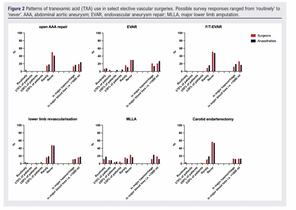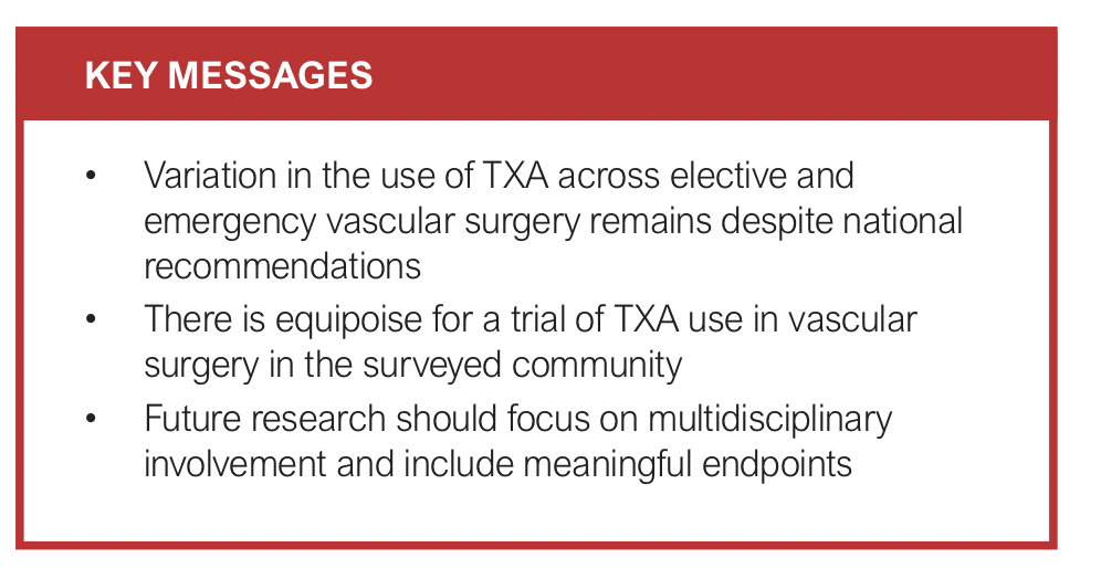 Conclusion: TXA use in vascular surgery is variable and context dependent. There is substantial clinical equipoise and strong support for a randomised trial, providing the study design reflects procedural heterogeneity and prioritises safety-related outcomes.