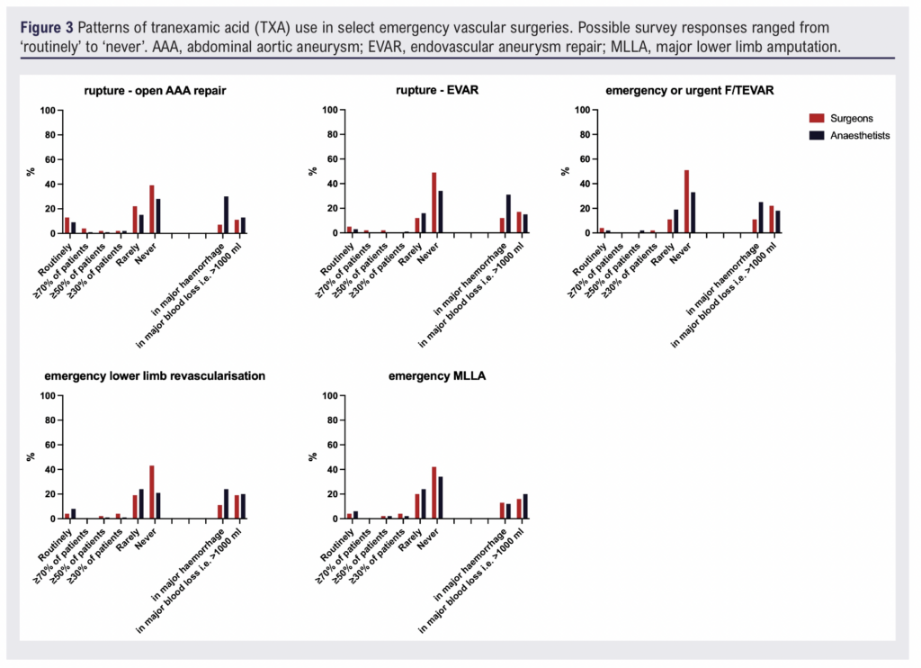 This survey highlights the need for procedure-specific and context-specific evidence. Vascular surgery encompasses a heterogeneous group of operations that vary widely in expected blood loss, duration and risk of thrombosis. Elective procedures such as carotid endarterectomy, which typically involve minimal bleeding and are highly dependent on preserving arterial patency, may not warrant prophylactic TXA administration whereas open aortic surgery or ruptured aneurysm repair may represent circumstances in which TXA could be beneficial. Nonetheless, these scenarios also represent the settings in which the balance between bleeding control and arterial thrombosis is most precarious, as rupture complicated by acute limb ischemia is associated with high morbidity and mortality. Similarly, the distinction between elective and emergency surgery is relevant; TXA may be used more readily in emergencies with established or anticipated haemorrhage whereas its role in elective settings is less clear. Future studies should account for these differences rather than treating ‘vascular surgery’ as a uniform category.