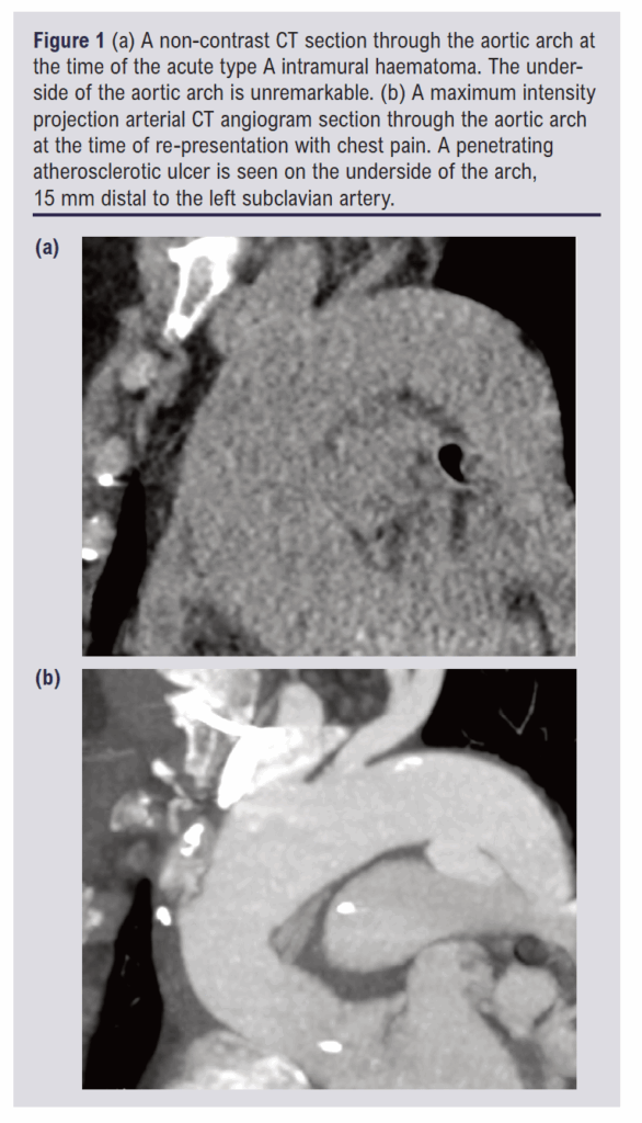 A 58-year-old woman presented with chest pain radiating to the back 6 weeks after emergency ascending aortic and aortic valve replacement and a single coronary artery bypass graft for type A acute aortic syndrome with ascending aortic intramural haematoma and haemopericardium. Medical history included atrial fibrillation since the cardiothoracic surgery, chronic obstructive pulmonary disease, hypertension and Hartmann’s procedure for perforated sigmoid diverticulitis 6 months previously. She smoked 10 cigarettes per day. The patient was morbidly obese (BMI 38), apyrexial and deconditioned since cardiothoracic surgery. All blood indices were normal, FEV1/FVC ratio was 65% and left ventricular ejection fraction was 50–55%. Computed tomography (CT) demonstrated a new penetrating atherosclerotic ulcer (PAU) on the underside of the aortic arch. After CT and following discussion with the patient, she was transferred to our vascular unit.
