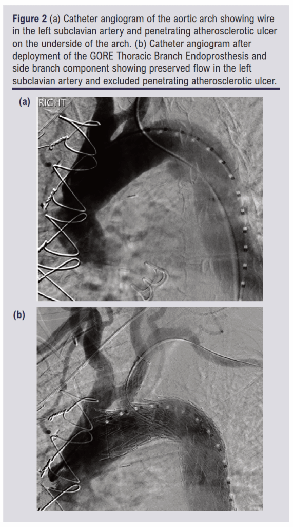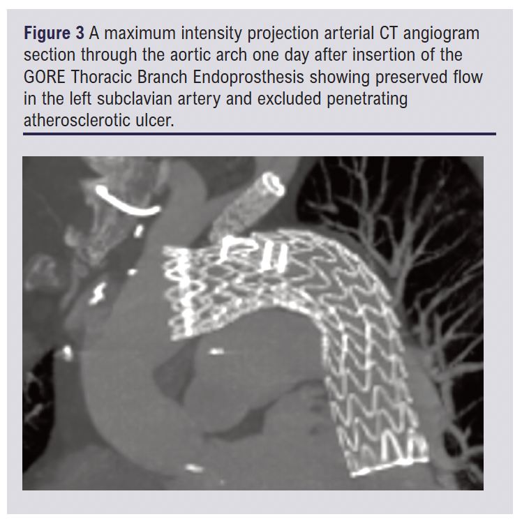 Guidelines recommend thoracic endovascular aneurysm repair (TEVAR) for complicated (refractory/recurrent pain) and large penetrating atherosclerotic ulcers (PAU)1,2 which may indicate a high risk of rupture.3,4 TEVAR is an established treatment for PAU. When a zone 2 TEVAR is performed, observational data suggest that left subclavian artery (SCA) revascularisation does not reduce neurological complications.5 However, when combined with long aortic coverage (>30 cm), left SCA revascularisation should be considered in an attempt to reduce the risk of spinal cord ischaemia.6 Custom-made devices are available but, due to manufacturing times, are unsuitable for urgent cases.7 The GORE Thoracic Branch Endoprosthesis (TBE) (WL Gore & Associates Inc, Flagstaff, Arizona, USA) is a commercially available off-the-shelf device with a single retrograde side branch. Its Instructions For Use (IFU) currently define its indication being in zone 2 of the aorta. The first European implantation of the device occurred in early 2024 and the device launched in the UK later that year.8