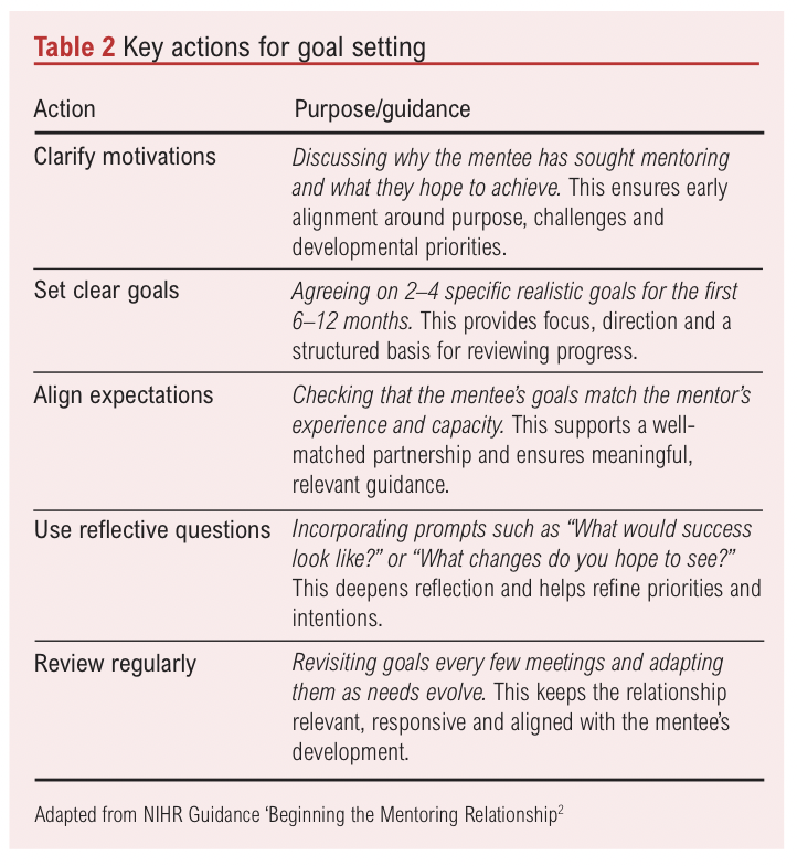 Once rapport and trust are established, mentoring pairs should focus on setting a clear direction for their relationship. Early conversations provide an opportunity to explore the mentee’s motivations, whether developing leadership skills, navigating complex clinical decisions, building confidence, supporting wellbeing or planning career progression. Clarifying these aims helps ensure both parties are aligned and that the mentor’s experience can be applied most effectively.