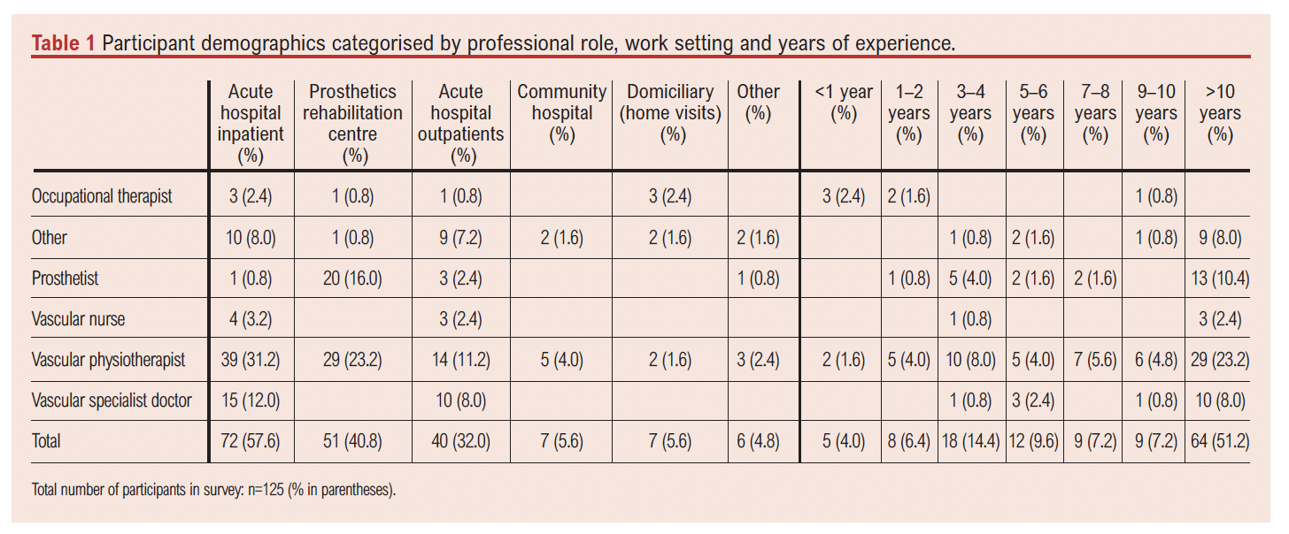 Information on the participants’ location of work was also obtained (Table 1). The largest number of participants (n=72, 57.6%) worked in an acute hospital inpatient setting and the smallest number of participants (n=7, 5.6%) worked in a community hospital or domiciliary setting. Vascular physiotherapists worked in the largest range of different settings while vascular specialist doctors and vascular specialist nurses both primarily worked in inpatient or outpatient acute hospital settings. The majority of prosthetist responders worked in prosthetic rehabilitation centres, with limited numbers in other clinical areas.