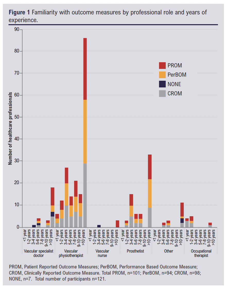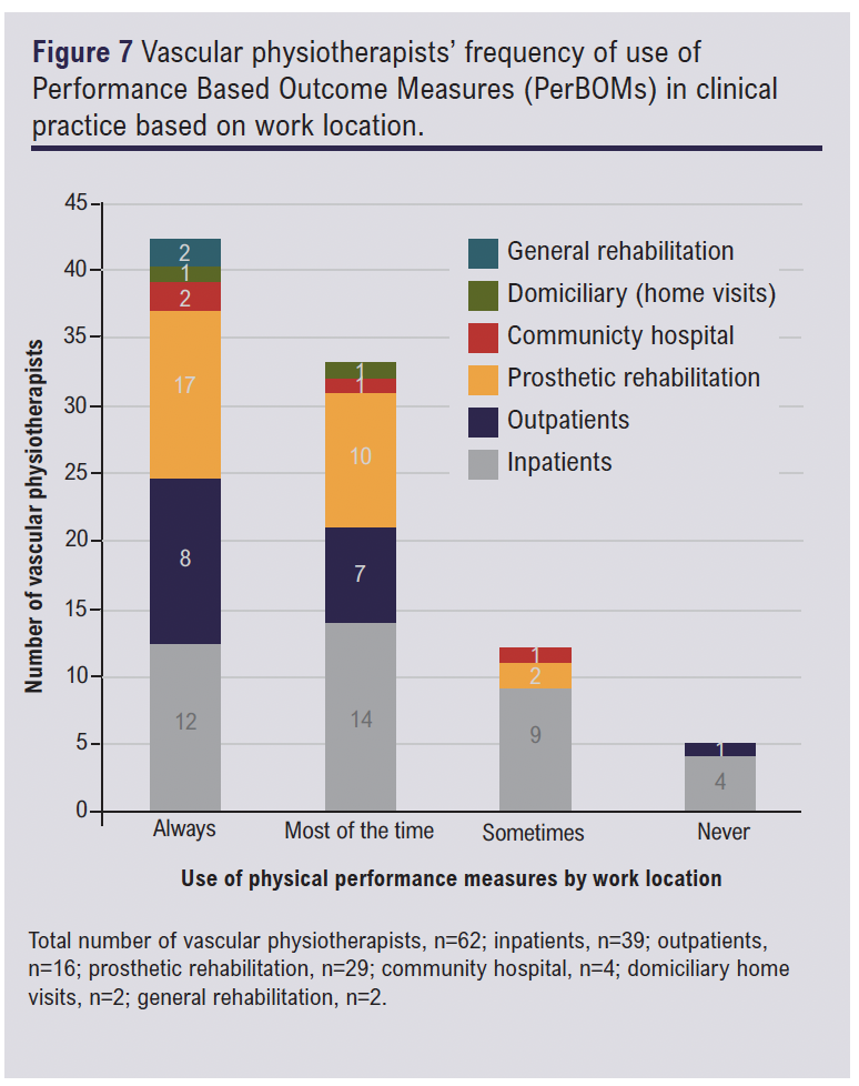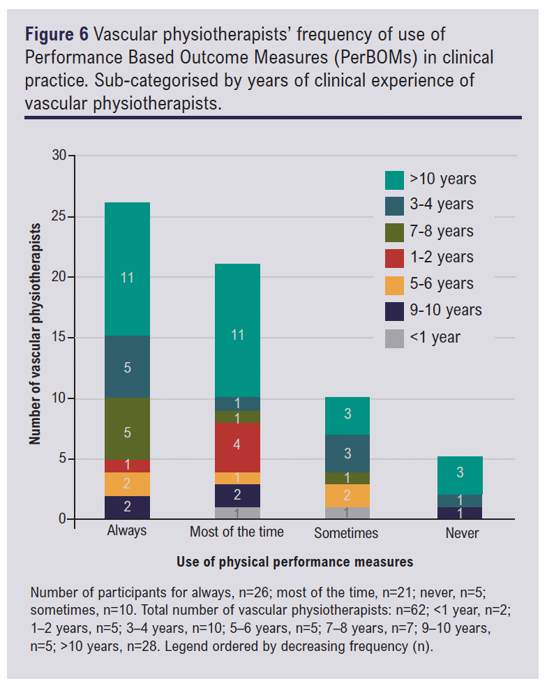 Previous evidence states that there are often issues with the use of PerBOMs in clinical practice when there is a lack of physiotherapist knowledge and experience of using outcome measures.21 Data in this survey suggest that PerBOMs are likely to be used by physiotherapists at all stages of clinical experience. This demonstrates that there was no relationship between the use of PerBOMs in clinical practice for vascular physiotherapists and the number of years in clinical practice, therefore indicating that clinical uptake of available PerBOMs may be due to other factors.