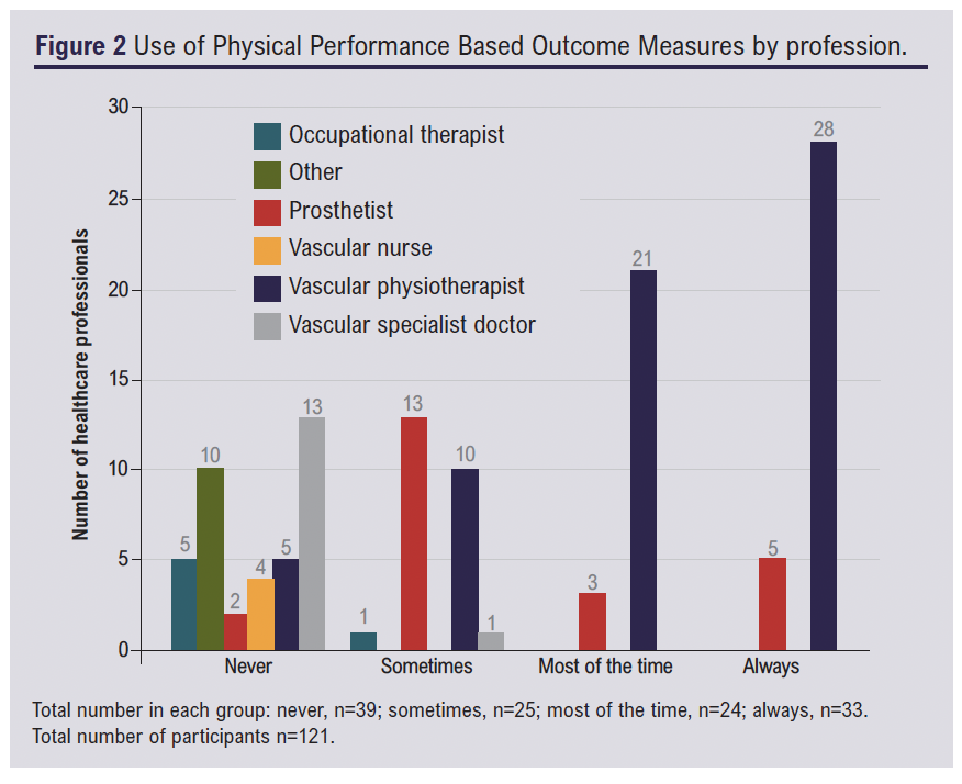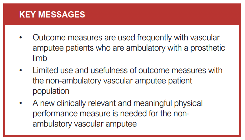 Vascular amputees live with disability and require appropriate assessment of their physical function for holistic clinical management and rehabilitation with Physical Performance Based Outcome Measures (PerBOMs) throughout their patient journey and as their PAD develops.11 Using appropriate PerBOMs within clinical practice can support healthcare practitioners (HCPs) to set patient goals and monitor progression whilst receiving treatment and rehabilitation.