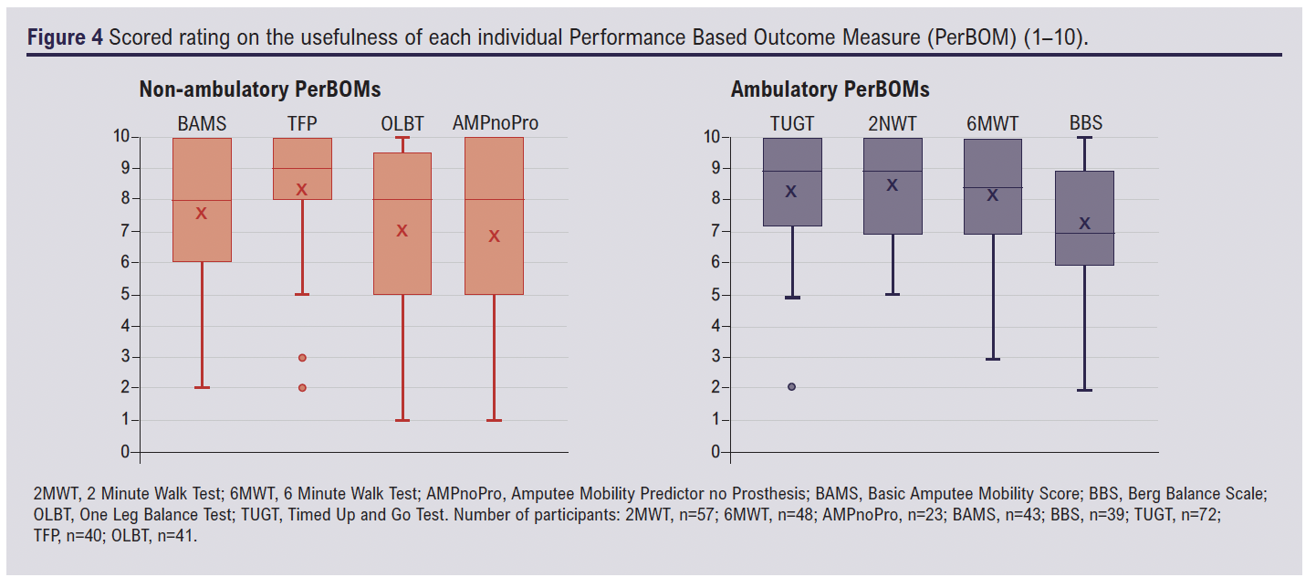For non-ambulatory PerBOMs the one with the highest median usefulness score is the TFP. However, the number of participants rating the TFP was around a third less than the number of participants rating the TUGT, the most commonly scored ambulatory PerBOM. Although the TFP was found to be relatively useful, this should be interpreted with caution as fewer participants rated the non-ambulatory PerBOMs compared with the ambulatory PerBOMs. There is a clear disparity between the current validated outcome measures12 and current clinical practice. This study suggests this variation could be explained by HCPs reporting limited usefulness of these outcome measures. Future research may focus on an investigation into the reasons for limited PerBOM use with non-ambulatory amputee patients. Development of a suitable, meaningful and clinically relevant new PerBOM is suggested, which may support the management of non-ambulatory patients.