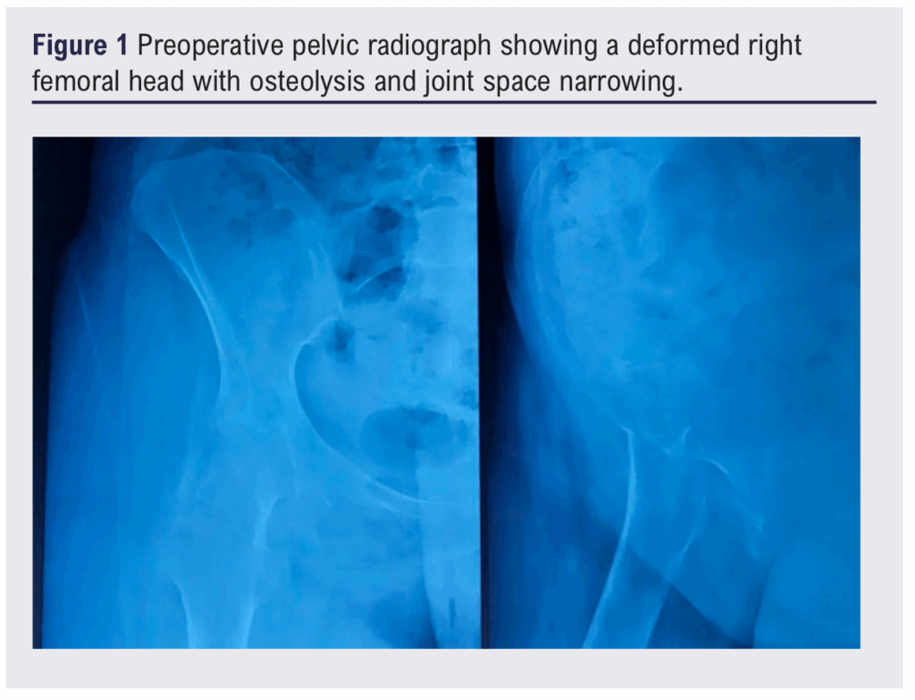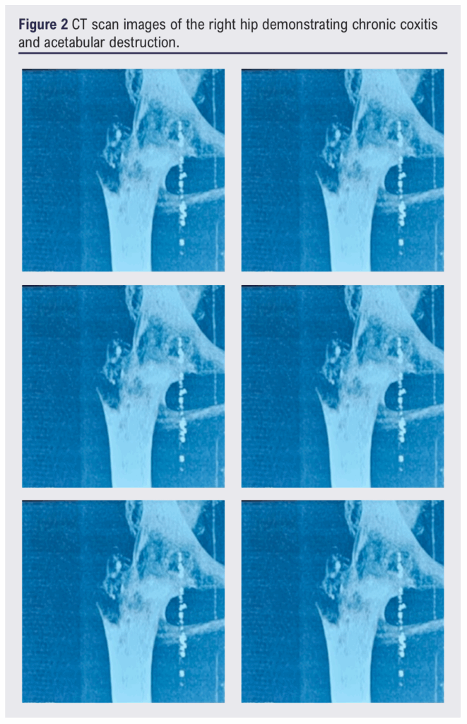 A 38-year-old woman with treated pulmonary tuberculosis presented with an 18-month history of right hip pain and limping. Examination revealed restricted flexion without vascular or neurological deficits. A pelvic radiograph demonstrated destruction of the femoral head and acetabular changes consistent with chronic coxitis (Figure 1). A CT scan confirmed chronic right-sided coxitis with muscular atrophy (Figure 2). Bone biopsy verified tuberculous infection. After multidisciplinary review she underwent THA using the Hardinge lateral approach. Intraoperative fluoroscopy was satisfactory and the early postoperative course was uneventful (Figure 3), with postoperative haemoglobin 9.6 g/dL.