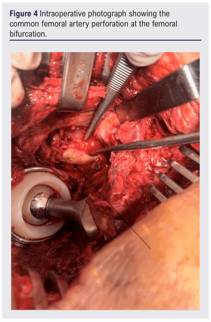 Common femoral artery perforation following THA is exceptionally rare but potentially life-threatening. Delayed presentation, as in this case, complicates diagnosis and management. Persistent groin pain, anaemia or neurological symptoms after hip arthroplasty should always prompt vascular evaluation. Early diagnosis and multidisciplinary collaboration between orthopaedic and vascular teams remain vital for limb salvage and survival. Preventive strategies include meticulous surgical technique, respect for anatomic variations and careful postoperative vigilance.