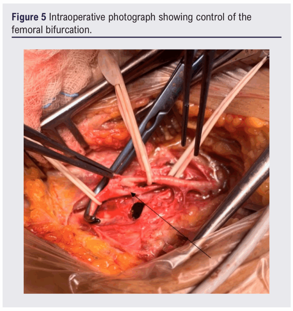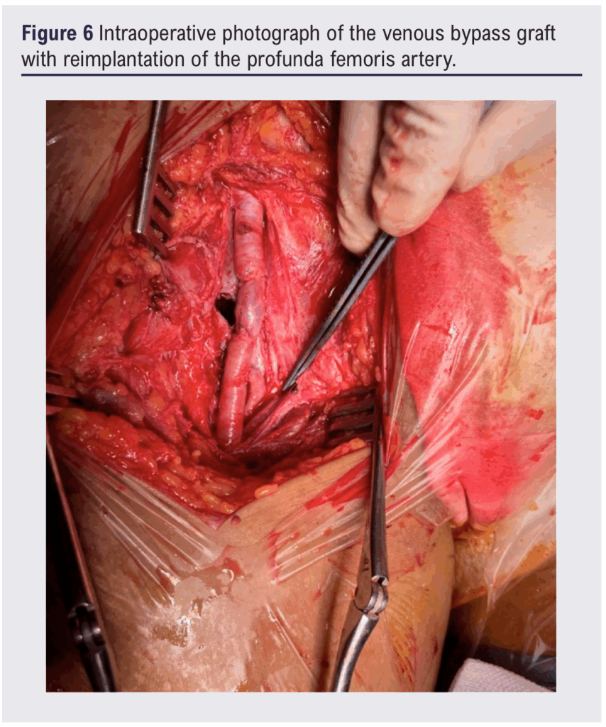 A large haematoma was evacuated, revealing active arterial bleeding at the femoral bifurcation. The vascular team was called. After proximal and distal control, a transfixing perforation of the CFA was identified (Figures 4 and 5). The damaged segment was excised and continuity restored with a reversed autologous saphenous vein graft from the CFA to the superficial femoral artery, with profunda femoris re-implanted into the graft (Figure 6). The patient recovered uneventfully with preserved limb perfusion.