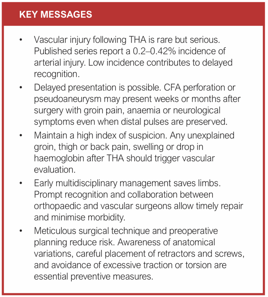 This experience underlines the necessity of continued postoperative vigilance and close collaboration between orthopaedic and vascular teams. Even in primary THA, awareness of vascular anatomy, meticulous technique and prompt multidisciplinary action are vital to preventing devastating outcomes.
