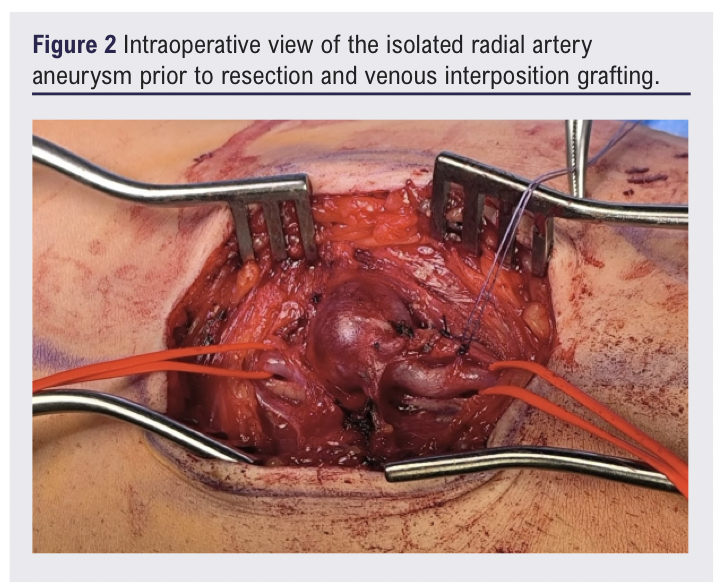 Fewer than 24 true radial artery aneurysms (RAAs) have been reported since the first description by Thorrens et al in 1966.1 While most radial artery aneurysms are pseudoaneurysms secondary to trauma or iatrogenic injury,2 true aneurysms – characterised by dilation of all three arterial wall layers – are exceedingly rare, usually idiopathic but may be associated with connective tissue disorders.3 Their diagnosis requires a threshold dilation of 1.5 times the normal radial artery diameter (2–3 mm).3 This case underscores the diagnostic and surgical challenges of idiopathic RAAs, which lack established aetiological frameworks. Surgical repair is indicated for symptomatic aneurysms or those at risk of rupture/thromboembolism.2,4 We report a case of idiopathic true RAA treated with resection and vein graft reconstruction, highlighting diagnostic and technical considerations.