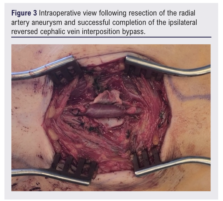 Due to the associated tenderness of the aneurysm and potential risks of complications (eg, distal thromboembolism, compression of neighbouring structures, and lifetime rupture risk), after discussion at the multidisciplinary team meeting and with the patient he was scheduled for surgical repair of the right proximal RAA.6 The surgical procedure was performed under general anaesthesia through a volar forearm approach. Meticulous dissection exposed the aneurysm while protecting the adjacent radial nerve (Figure 2). This incision was also used for the cephalic vein harvest which was later used for the bypass.