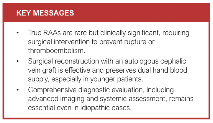 A RAA is characterised by a localised dilation exceeding 1.5 times the normal diameter of the vessel, which typically measures 2–3 mm in healthy individuals.3 A true aneurysm involves all three layers of the arterial wall (intima, media and adventitia) and often results from structural weakening.3 While most RAAs are pseudoaneurysms caused by trauma or iatrogenic injury (eg, arterial cannulation), rare cases are associated with connective tissue disorders, repetitive occupational trauma or idiopathic aetiologies.9 RAAs typically present as a pulsatile mass and often require surgical intervention to mitigate potential complications including thromboembolic events or neurovascular compression.6,9 Clinical manifestations may include pain, sensory disturbances (such as numbness or paraesthesia) or signs of distal thromboembolism.4,9 While ultrasonography serves as the primary non-invasive diagnostic modality, advanced imaging techniques – including CT angiography, MR angiography and conventional angiography – provide comprehensive vascular assessment when indicated.10