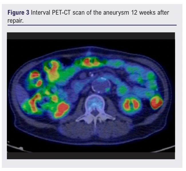 An interval PET-CT scan (Figure 3) was performed around 12 weeks after surgical repair which showed patchy uptake within the aortic graft, likely to represent postoperative changes post-intervention. Clinic review five months after surgery was reassuring with the patient recovering well and tolerating oral doxycycline along with normal blood tests. The agreed plan was for a further interval PET-CT scan at 10 months after surgery (November 2025) with subsequent review and discussion in clinic regarding whether to continue or stop antibiotic suppression at that point.