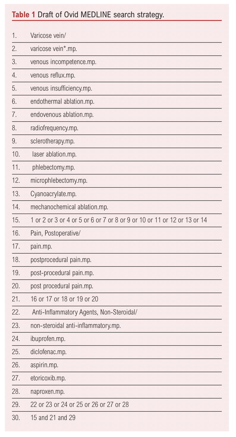 The databases will be searched for studies reporting the use of NSAIDs following SVI interventional treatment using keywords, equivalent words and Medical Subject Headings (MeSH) terms to maximise search sensitivity. Search terms will include but are not limited to ‘non-steroidal anti-inflammatory’, ‘ibuprofen’, ‘varicose veins’ and ‘postprocedural pain’.