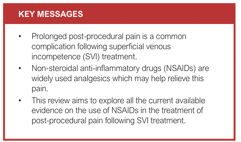 Administration of non-steroidal anti-inflammatory drugs (NSAIDs) is therefore a potential solution to this persistent pain. NSAIDs have dual activity, providing analgesia as well as reducing the body’s inflammatory response. This may reduce the severity of symptoms, allowing patients to return to normal daily activities. Additionally, early administration may also prevent the activation of this persistent pain cascade by reducing inflammation. There is evidence for the use of NSAIDs to treat similar short/medium-term inflammatory processes such as musculoskeletal pain and in other surgical and non-surgical settings.19-21 Therefore, a systematic review of the literature to ascertain the effect of NSAID use on post-procedural pain and patient recovery following SVI treatment is warranted.
