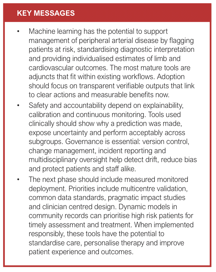 Risk stratification for both major adverse cardiovascular events and major adverse limb events is central to PAD care, and this is an area where ML has achieved clinically meaningful performance on large registries and multi-institutional datasets. Recent studies using the Vascular Quality Initiative and other consortia demonstrate that ML can estimate 30-day and long-term risks of major adverse limb events, amputation, reintervention, pour wound healing and major adverse cardiovascular events with very good discrimination and improved calibration relative to traditional scores.19 Multicentre registry analyses have trained and tested models to predict short and long-term adverse outcomes after endovascular intervention, showing reasonable performance and calibration. However, they also highlight the need for external validation and clinically actionable risk outputs. Similar models for bypass outcomes show promise, but generalisability remains challenging due to device and conduit-specific heterogeneity, centre effects, and missingness in key variables (e.g., runoff).20-25 At this stage, selective deployment of validated models to inform shared decision-making and surveillance planning is appropriate provided calibration is satisfactory, probabilities are communicated transparently and local performance has been verified. Subgroup performance should be reported and shown to be acceptable in view of well-established disparities in PAD presentation and outcomes.