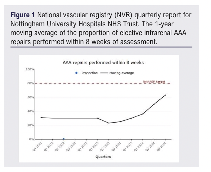 Figure 1 shows the moving average of the proportion of AAA repairs performed within 8 weeks of assessment. It is clear that from the first quarter of 2024 (Q1 2024) onwards, there was a significant improvement in this metric. By the third quarter of 2024 (Q3 2024), over 60% of AAA repairs were performed within 8 weeks, compared to only 34% in Q1 2024. This represents a significant improvement in our performance against the 8-week target.